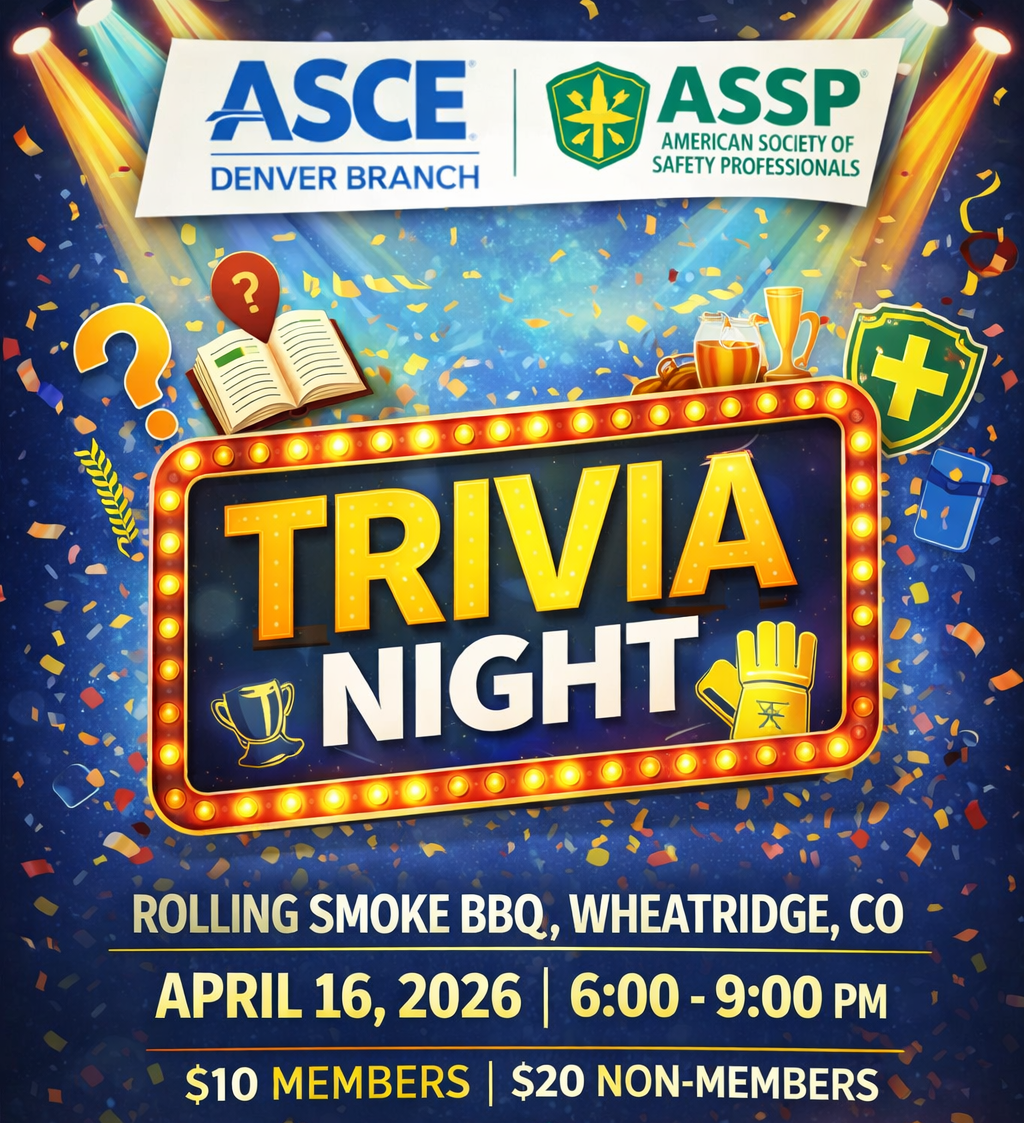 Come and test your engineering and Colorado knowledge once again at our annual trivia night with ASSP. We are pleased to announce that Stauffer Gloves and Safety will be once again graciously sponsoring this night and providing prizes to the top teams. Ticket prices include food and beverages. So come and join us for a relaxing night of networking, fun, and prizes. See you there!