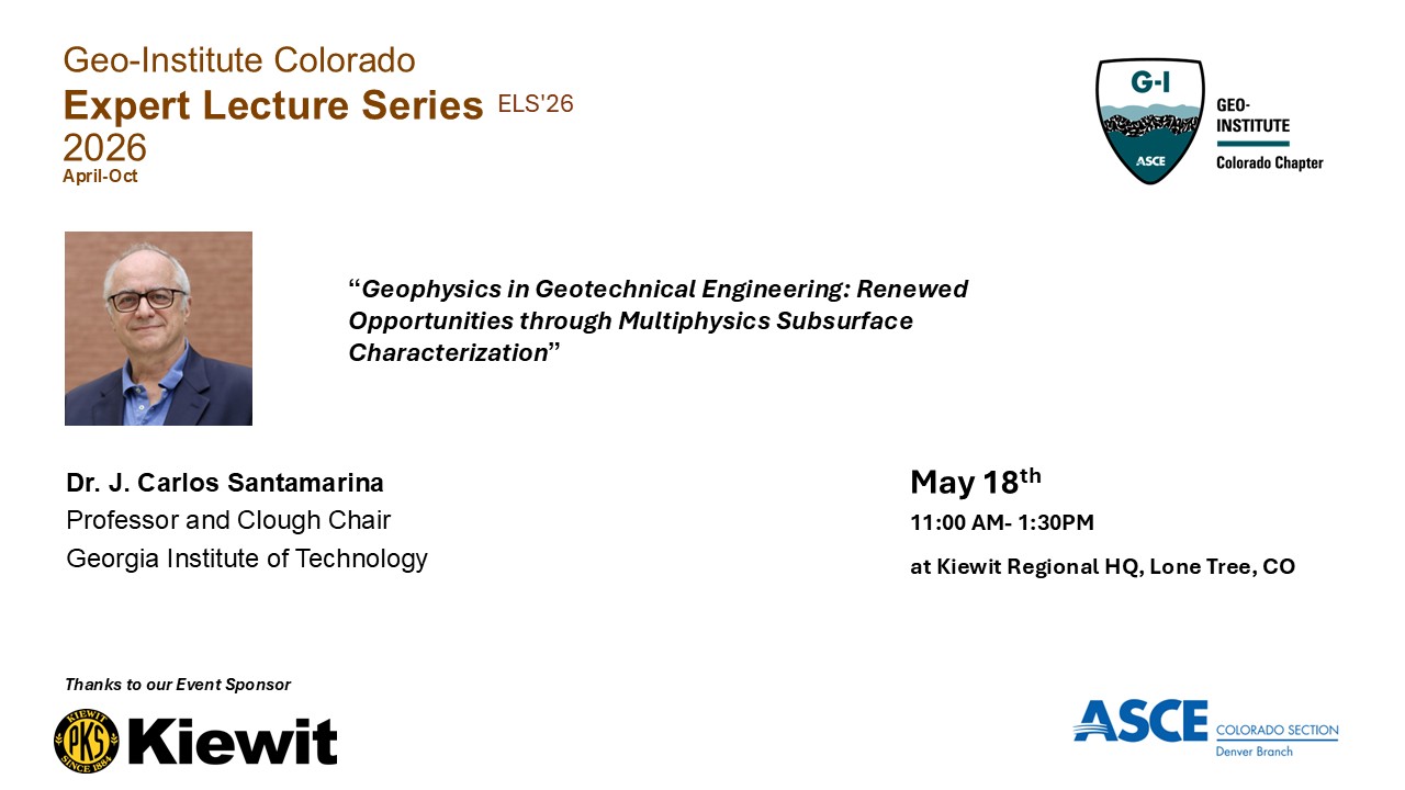 Join the ASCE Denver Branch and the Geo-Institute Colorado Chapter for the second installment of the 2026 Expert Lecture Series featuring Dr. J Carlos Santamarina, Professor and Clough Chair at the Georgia Institute of Technology. This lecture will further explore geophysics in geotechnical engineering through Multiphysics subsurface characterization.
