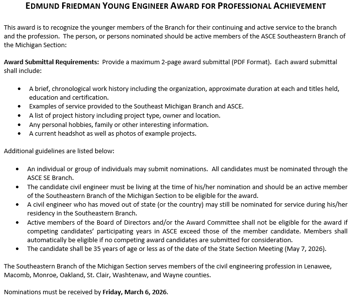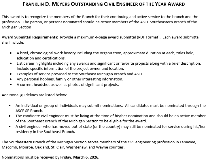 Each year at the Annual Meeting for the Michigan Section Southeastern Branch, we recognize excellence in Civil Engineering with the following awards: