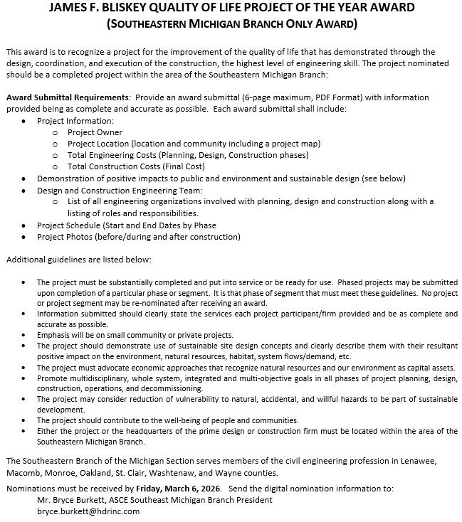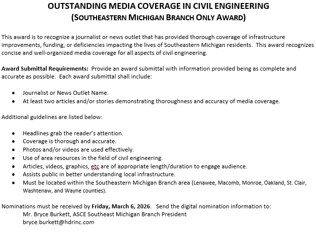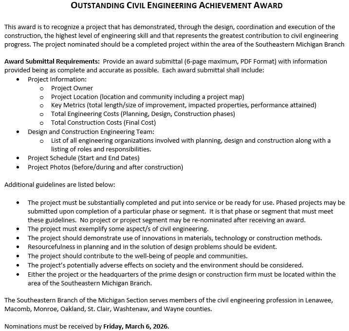We look forward to your nominations to celebrate Detroit-area Civil Engineering!